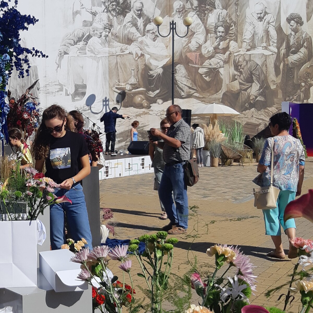 Вот с таким настроением, под мотивчик песни "Старый отель" Жанны Агузаровой, двигалась я в направлении места события - Пушкинской площади, где вот-вот фанфары должны были возвестить об открытии фестиваля цветов. Прибыв на место, застала участников за последними приготовлениями. Людей ещё было не много, но фото-зоны уже были готовы и гости фестиваля с энтузиазмом их осваивали. Символом фестиваля стала хризантема. Поэтому этот цветок присутствует практически в каждом букете. А цвета фестиваля - оранжевый и фиолетовый- цвета логина спонсора фестиваля компании Ростелеком. В букетах из сухоцветов таких сочетаний не наблюдалось, но сами букеты хорошо контрастировали с буйством осенних красок и вели себя сдержанно и достойно. Флористы из компании "Культура" представили свои композиции в оригинальной упаковке из картона. Познакомившись с разными типами культуры составления букетов из живых цветов, и восточной и западной, я отправилась в музейный дворик, где мастера рукотворных бук