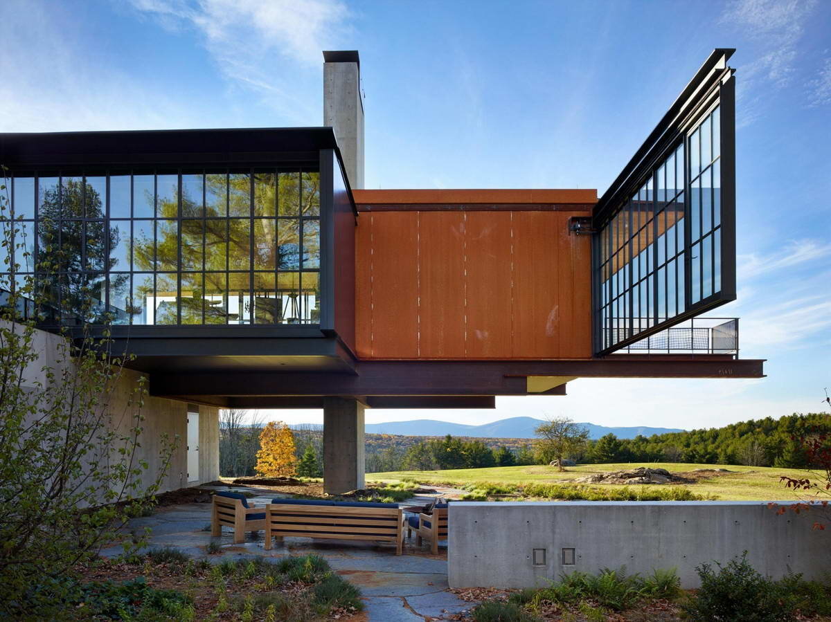 Сам дом узнаваем для творчества студии Olson Kundig, он имеет эффектную динамику, выполнен в металлических конструкциях с большими окнами и большим количеством дерева. Кроме того, присутствуют и механизмы для открывания, также характерные для этой команды. Такая архитектура делает его открытым окружающей природе все четыре сезона...