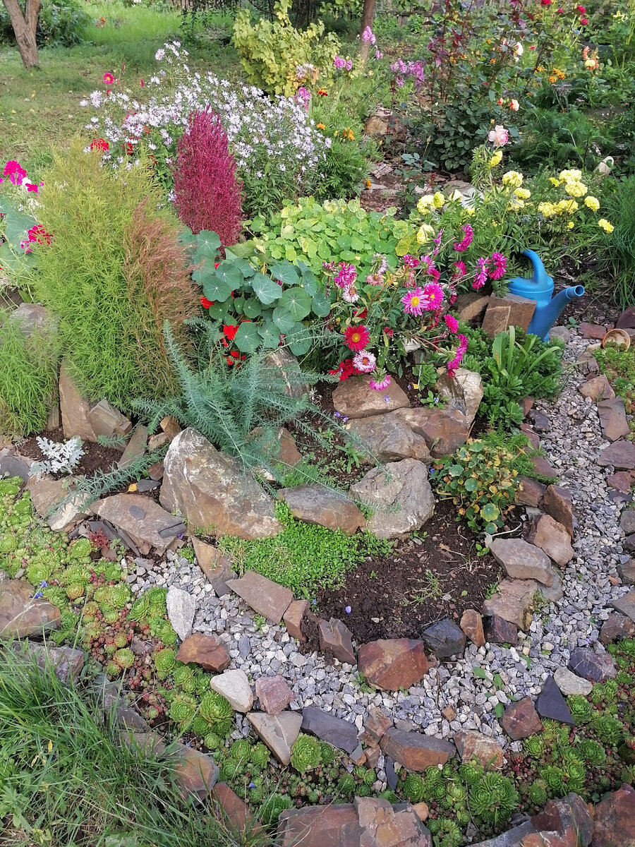 Сегодня решила заняться своей альпийской горкой. Вот так она выглядела совсем недавно . А сейчас я убрала настурцию, астры. И решила убрать ряд камней. Расширила реку из каменных роз. А ещё расширила пространство до водопровода. Все перрекопала и перенесла ряд больших камней к водопроводу. Устала очень. Результатом осталась довольна. Более подробно в видео до этой статьи .