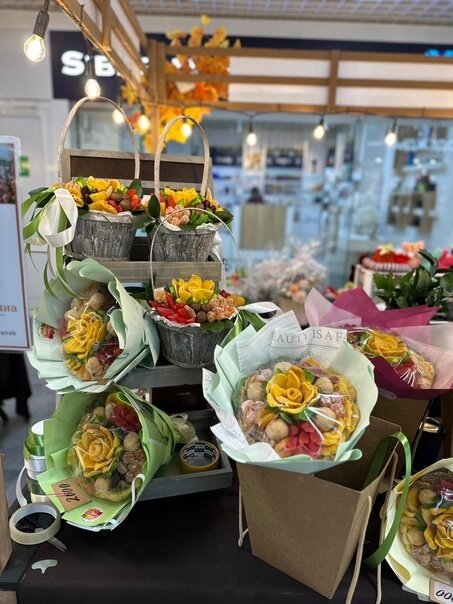 В составе сухофрукты, вкусные орешки, большое количество упаковок есть в наличии.Я с букетамм ТК «Макс» на втором этажеТак же в небольшом количестве буду привозить букеты в Сити Парк каждое утро.
