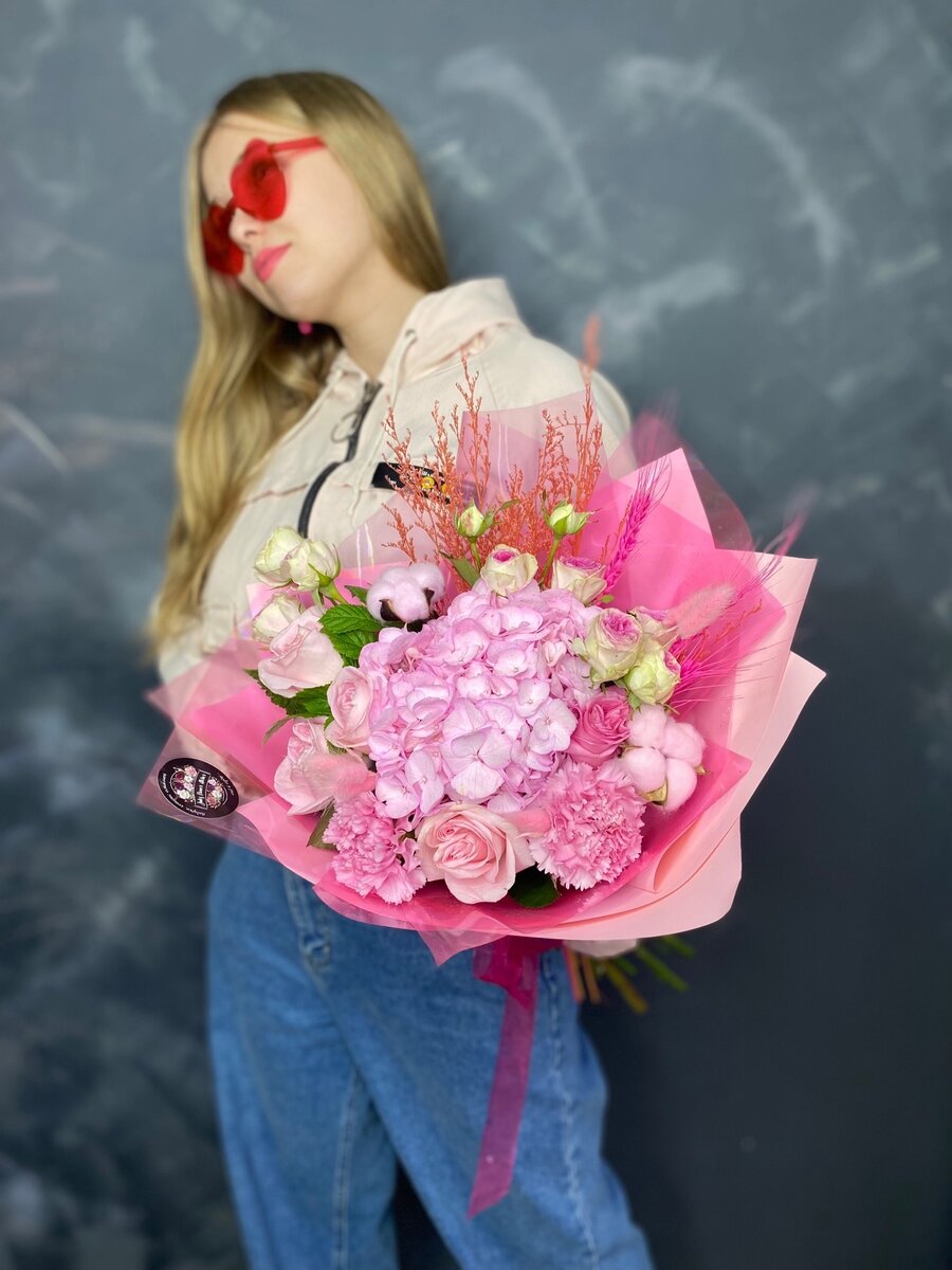 Нежные розы, гортензия, диантусы, кустовая пионовидная роза, колоски пшеницы и стабилизированный лимонниум. Невероятно розового цвета 🩷