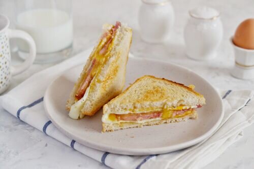 Ингредиенты: Хлеб – 50 г Яйцо куриное – 1 шт. Сыр полутвердый – 50 г Ветчина – 20 г Масло подсолнечное – 2 ч.л. Соль – по вкусу Перец черный – по вкусу Приготовление: Шаг 1 Для приготовления такого сэндвича подойдёт любой хлеб, не только тостовый. Можно также взять и ржаной хлеб. Вместо ветчины подойдет практически любой мясной продукт - колбаса, буженина, отварная куриная грудка. Сыр тоже может быть любой по-вкусу. Шаг 2 Сыр натереть на крупной тёрке, отрезать 1-2 ломтика ветчины, зависит от размера. Если берёте отварную куриную грудку, то ее тоже нужно нарезать нетолстыми ломтиками. Шаг 3 Сковороду поставить на небольшой огонь, немного прогреть, смазав растительным маслом для жарки. Разбить яйцо, выложить его на сковороду. Сразу же лопаточкой нужно аккуратно распределить яйцо по сковороде, так, чтобы желток тоже растёкся. Размер яичной лепешки довести по площади до размера двух ломтиков хлеба, с которым вы будете делать сэндвич. Немного посолить и поперчить. Шаг 4 Сверху яйцо пос