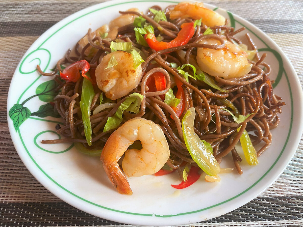 Из-за необычной осени остатки сельдерея убрали только вчера, потому что с ночи предсказывали значительное снижение температуры воздуха. Кто-то его не любит, а у нас сельдерей в почёте, добавляем в супы, соки, любим добавлять в салаты, дошла очередь и до собы. Решила приготовить на пробу Собу с сельдереем. Мужу так понравилось, что он удивился почему я раньше сельдерей к овощам не добавляла. По обыкновению добавила креветок, но и без них -