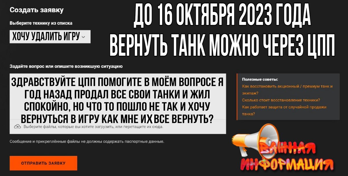 Привет танкисты! Действительно важная новость мира танков любезно предоставленная нам от компании lesta games : дело в том что уже начиная с 16 октября проданные танки вернуть себе на аккаунт через ЦПП ( за даром) будет невозможно. Всё ребята ЦПП теперь будет заниматься важными делами😆 Функция восстановления танков прямо в ангаре конечно же сохранится, но там как известно не весь список машин которые подлежат возврату , а лишь их часть. Ранее абсолютно любую машину можно было ( через мольбы о помощи ) восстановить в центре поддержки пользователей , но теперь как говорится давай сам бро!!! И не за просто так, а за денюшку. Поэтому кто ещё в игре : вам надо до 16 октября определиться с теми танками которые вы хотите вернуть себе во что бы то не стало и соответственно начать долбить ЦПП,а у них с выходом этой новости думаю заявок поприбавится и ответа ждать придётся дольше к гадалке не ходи. Так что не откладывайте в долгий ящик возврат своих бурасиков , bz-176 , унылых огнемётов со ш