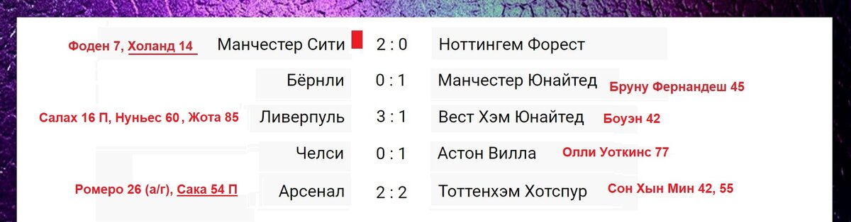 В чемпионате Англии состоялись матчи 6-го тура. Три великих клубов потеряли очки. Смотрим результаты. . Манчестер Сити в жарком поединке победил Ноттингем 2-0. Дело в том, что в матче было 11 жёлтых карточек. А на 46-й минуте игрок «горожан» получил удаление. До этого в первом тайме успели отметится Фоден и Холанд, который продолжает возглавлять список бомбардиров. Но героем встречи всё же признали Фодена. Ребята Пепа Гвардиолы побеждают в 8-й игре подряд. . Бёрнли уступил МЮ 0-1. Манчестер забивает на выезде мало, в среднем 0,67 гола за игру, что и доказал в этой встрече. Манкунианцы прервали свою трехматчевую проигрышную серию. Бруну Фернандеш забил за клуб всего 2-й гол, также прибавим 4 мяча за сборную. Итого – 6 мячей в сезоне. . Дорогие, друзья! ❤ Попрошу вас в конце выпуска кликнуть на ссылку нашего спонсора, так сказать, чтобы каналу помочь и угостить автора чашечкой чая. . Ливерпуль переиграл Вест Хэм 3-1. На своем поле Ливерпуль последний раз проигрывал Вест Хэму 10 матчей на