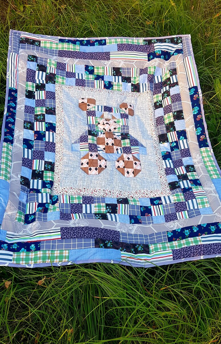 Всем привет! Сегодня дошила лоскутное детское одеяло. Размер получился 105×145см. Сначала сшила середину по картинке из пинтерест, ни чего сложного, смотрела ,нарезала,сшивала. Далее нарезала квадраты по 7 см. и сшила их в хаотичном порядке. Задняя сторона у меня тоже сборная ,сшила квадраты 40×40 см. Внутри синтепон 200 мм. Сложила три слоя, сметала и на машинку стегать. Стёжка далась не совсем легко, стегала на малом ходу,что бы избежать смешение ткани, но в некоторых местах смешение все же произошло. На тех участках, где произошло смешение я стежку отпорола. По краю пришила бейку 7см сложенную вдвое. Все ткани перед пошивом были постираны и отутюжены. В процессе пошива все швы также проутиживала с паром. По краям, что бы нарастить полотно ,нарезала полоски ткани, так же по 7 см. Нарезала,сшивала,нарашивала. И вот такое одеялко получилось!