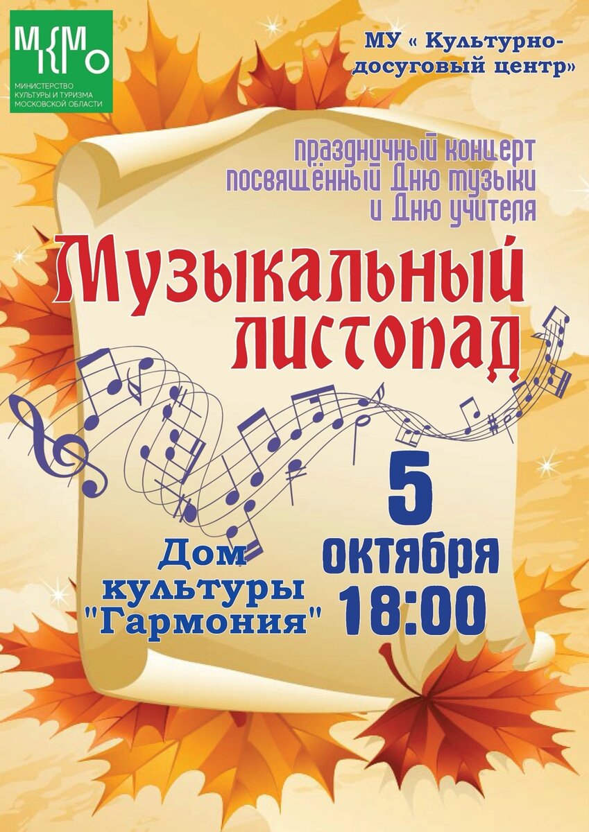 🎼 Детская музыкальная школа №2 ПРИГЛАШАЕТ 🎶 5 октября в 18.00 в Дом культуры «Гармония» на концерт 🍂"Музыкальный листопад", 🍁 посвящённый Дню музыки и Дню учителя. В концерте принимают участие преподаватели и учащиеся школы. Вас ждет увлекательная встреча с миром музыкального искусства 🎵