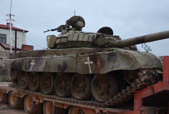 Возле одного из зданий, украшенного огромным вертикальным полотнищем с флагом Азербайджана, прямо на обочине стоял Т-72 с белым крестом — опознавательным знаком сепаратистов. Танк буро-песочного цвета под цвет окрестных гор стоял на платформе тягача и служил своеобразным знаком — именно здесь, во дворе азербайджанские военные устроили выставку оружия, изъятого в ходе антитеррористической операции. Оружие не было сдано добровольно, а захвачено в качестве трофеев.