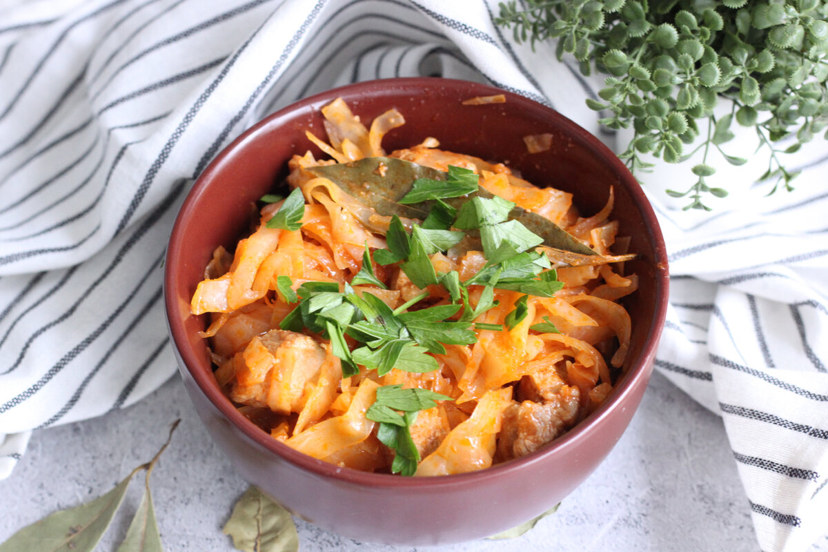Растительное масло Лук нарезать полукольцами. Обжарить на растительном масле. Свинину нарезать небольшими кусочками. Добавить к луку обжаривать минут 10. Капусту нашинковать. Добавить в посуду к луку и мясу. Влить томатный сок, добавить лавровый лист и специи. Перемешать. Накрыть крышкой и готовить на слабом огне минут 30.