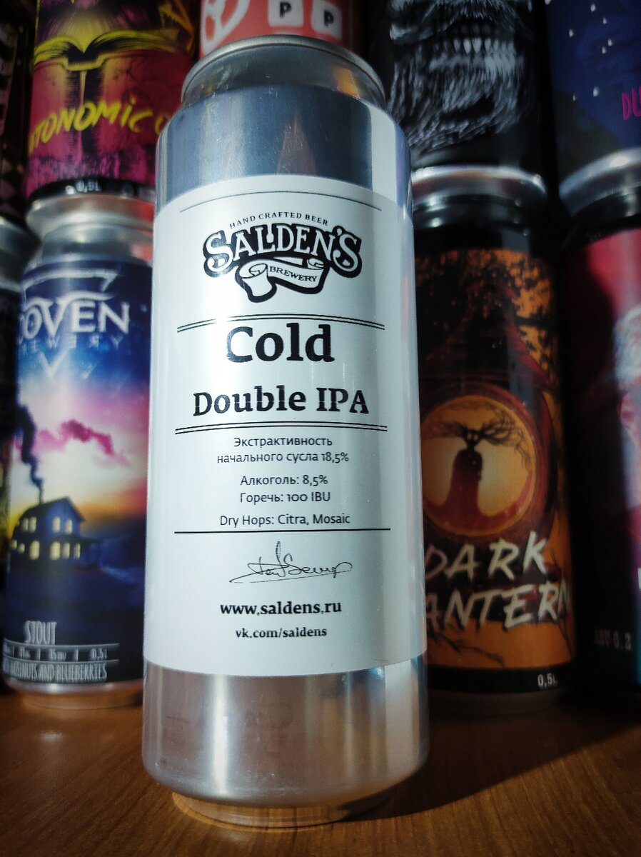 Как я писал ранее, количество Салденсов на канале резко увеличится. Зайдя на днях в магазин в поисках новой «жертвы», моё внимание привлекла надпись «Cold double ipa», до этого момента я пробовал только cold ipa от горьковской и был не сильно впечатлен. Также я немного рассказывал, откуда появился стиль «холодный ипа». Но ДАБЛ ипа я не видел ещё ни у кого, так что пора оценить, что же пивовары из Тулы нам сварили. Цена: 225 рублей Производитель: ООО «Добрый Хмель» г. Тула Состав: Вода, Солод пивоваренный, Хмель, Дрожжи. Экстрактивность начального сусла (OG) – 18,5% Объемная доля спирта (ABV) – 8,5% Горечь (IBU) – 100 Пена: Пышная, крупнозернистая. Её много и долго держится. Цвет: Мутноватый, карамельный. Аромат: Цитрус и лёгкая карамелька. Вкус: Очень плотное. Сначала на язык прилетает вкус цедры грейпфрутов, потом появляется вкус карамельки со своей сладостью, и всё это накрывается приятной горчинкой. На послевкусии оттенок сладости с горечью. Алкоголь не чувствуется даже после прогр