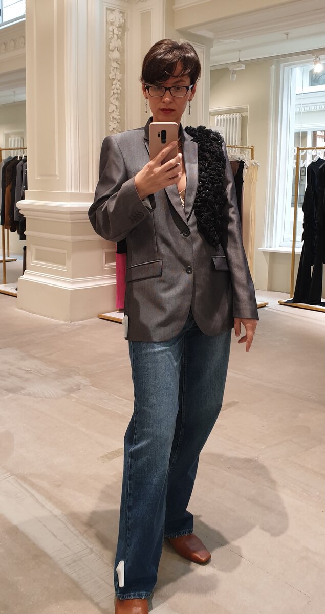 Я сочетала жакет с джинсами Blue на средней посадке от бренда SLAD. У бренда есть сайт sladbrand.ru, но на сайте бренда нет этих джинсовых брюк. Вот такие дела🤷♀️. На мне размер 29, хотя ношу обычно 28. Так что джинсы чуть-чуть свободные, но это им абсолютно не мешает хорошо смотреться на фигуре.