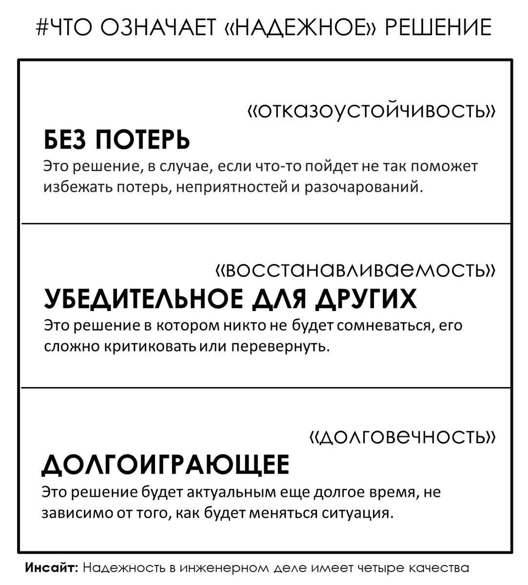 Речь пойдет о надежности решений. Как бы то ни было, надежность - это один из показателей качества. А значит, что говоря о надежности нельзя не упомянуть про качество решений. Конечно, без надежности невозможен разговор ни об эффективности, так как мы просто не успеем выйти на должный уровень производительности, все уйдет в затраты на ремонт и восстановление. И саму надежность можно считать безусловным благом, которое мы включаем в свод неписанных правил, усвоенных в детстве со словами "что такое хорошо, и что такое плохо". Но когда речь заходит о принятии решений, то мнения на счет надежности решения расходятся и здесь может появится недопонимание с разных сторон. А потому тройственность понятия "надежность" по отношению к принятию решений я представлю на матрице (Прием Гипермышления #МЕМ). И если я говорю про надежность плана (как суммы решений) или надежность договора (как взаимные обязательства), то подразумеваю: 1. отсутствие потерь - т.н. непредвиденных з