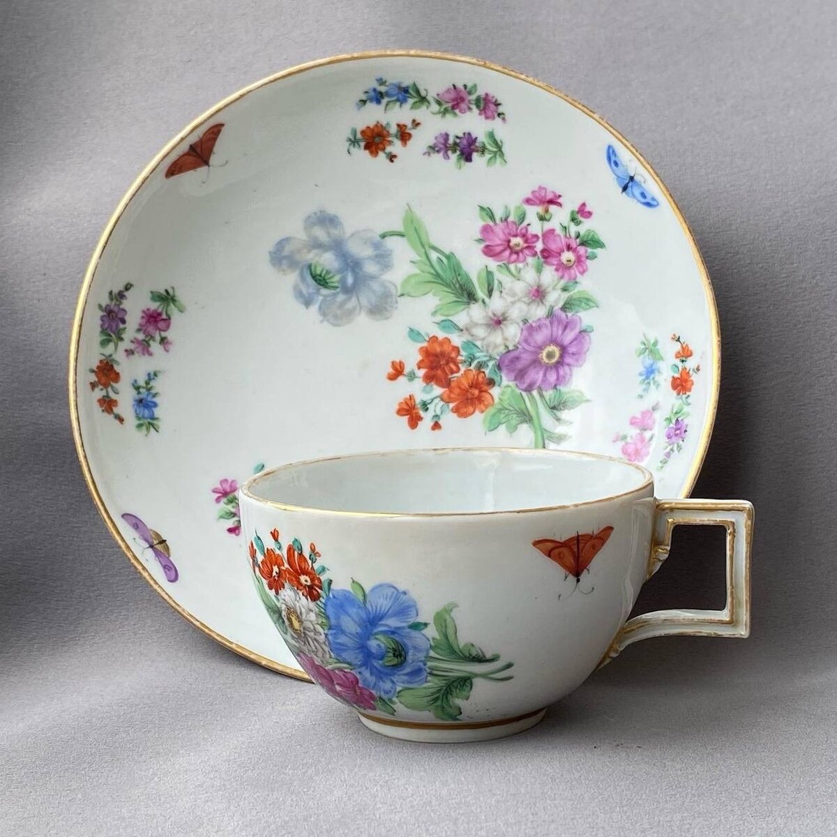 🔥⚔️ MEISSEN ⚔️, начало XIX века🔥 Приветствую, дорогие друзья! Я не из тех драконов, которые прячут свои драгоценности😂. Как только в мои руки попадается сокровище, я сразу же спешу его показать в подробностях и немного рассказать о нём. И сегодня я хочу вам сегодня показать редчайшую чайную пару Meissen начала XIX века. Полностью расписанная пышными садовыми цветами - предками будущих знаменитых 💐 мейссенских букетов, и нежнейшими бабочками🦋 Живопись может показаться немного романтичной и достаточно фантазийной, но это самое начало становления европейской школы росписи фарфора. Похожие букеты красовались на фарфоре Венской Королевской мануфактуры или на Вседневном сервизе Императорского Фарфорового Завода. В руке столь старый фарфор ощущается совершенно иначе. Тяжесть, другие тактильные ощущения, он будто бы теплее, чем современные предметы из того же материала. Что самое прекрасное - пара в отличной сохранности👍 Сколов, трещин и реставраций нет. На донном кольце чашки есть