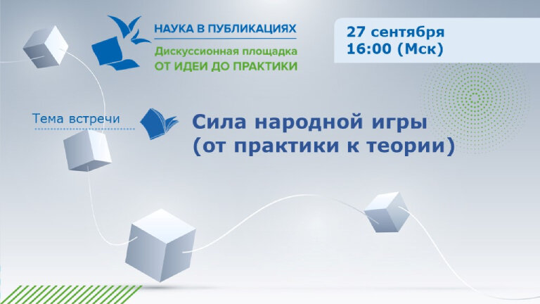 27 сентября 2023 годас 16:00 до 17:30 по Московскому времени на дискуссионной площадке «Наука в публикациях: От идеи до практики» состоится вебинар «Сила народной игры от практики к теории». В рамках вебинара будут анализироваться народные игры как как коррекционно-профилактический ресурс. Обсудим проблемы внедрения фольклорной игровой практики в образовательных, досуговых, исправительных организациях.