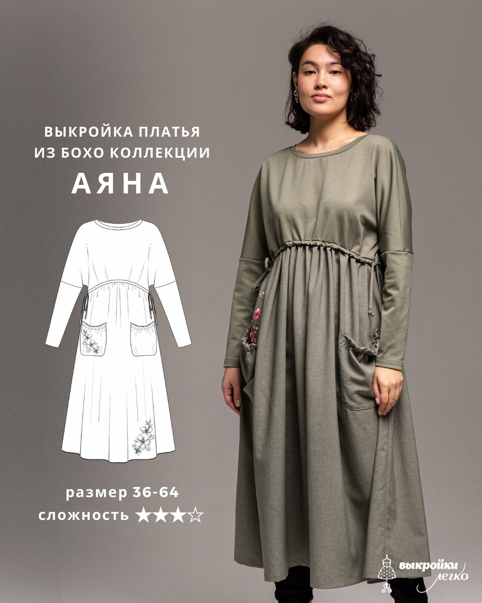 Свободное платье скомбинировано из разных материалов: мягкого трикотажа и плотной ткани. Такое сочетание делает платье особенно удобным, комфортным и дает простор для творчества. Достоинства модели: — А-силуэт — два материала: трикотажный лиф и юбка из ткани — завышенная линия талии — кулиска и поясок — возможность регулировки ширины платья — спущенное плечо — без вытачек и застежек — объёмные накладные карманы — вышивка — подходит для беременных — длина миди Выкройка платья из бохо коллекции «Аяна» сегодня со скидкой 30% https://patterneasy.com/ready-patterns/dress-ayana