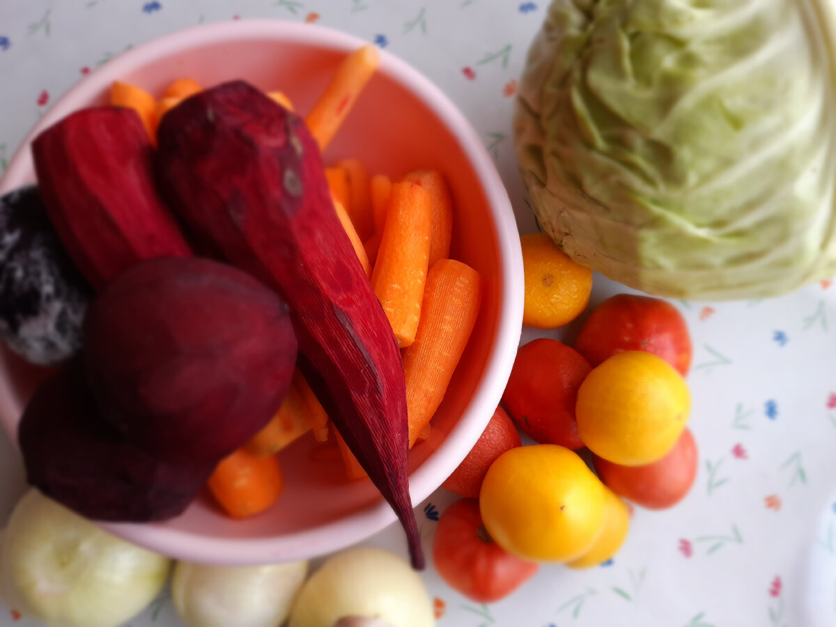 Перепробовала разные варианты приготовления заготовки борща на зиму, и, наконец-то, нашла очень вкусную борщевую заправку, которая хорошо хранится всю зиму. Делюсь с Вами этим рецептом. Нам понадобится: • Помидоры 1 кг. • Свёкла 1.5 кг. • Морковь 1 кг • Лук 0.4 кг • Капуста 2 кг. • Чеснок 2-3 головки • Соль 4 ст.л. • Сахар 4 ст.л. • Лавровый лист 6-7 шт. • Чёрный перец горошек 8 шт. • Вода 7 ст.л. • Уксус столовый 70% 1-2 ст.л. • И немного растительного масла Все овощи промываем, чистим и приступаем к приготовлению. Помидоры нарезаем дольками. Свёклу можно нарезать соломкой или натереть на крупной тёрке. Морковь также натираем на крупной тёрке. Капусту шинкуем. Лук режем полукольцами. Смазываем большую кастрюлю/казан/таз небольшим количеством растительного масла. В первую очередь обжариваем лук до золотистой корочки. Далее добавляем остальные овощи, добавляем воду, специи, хорошо перемешиваем и тушим минут 30 на медленном огне периодически помешивая ,чтобы не пригорело. Далее