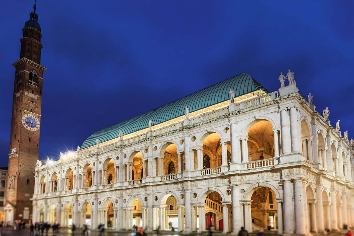 Первая значительная постройка Палладио — знаменитая Базилика в Виченце (начата в 1549 г., окончена в 1614 г.). Это столь же крупное и подлинно гуманистическое по общему духу сооружение, как и венецианская Библиотека Сан Марко. Ее архитектурный облик, проникнутый глубокой серьезностью, торжественной монументальностью, отличается в то же время благородной простотой форм и богатством материала — белого истрийского мрамора. Ядром сооружения явилась выстроенная еще в середине 15 в. ратуша с огромным залом во втором этаже. Окружив его галлереями в виде двухъярусной ордерной аркады, сочетавшей римскую мощь с венецианской легкостью, Палладио придал зданию величие и в то же время доступный, открытый характер общественного сооружения, тем самым развив и совместив архитектурные качества, развивавшиеся до того раздельно либо в ордерных фасадах итальянских дворцов, либо в аркадах их внутренних дворов. В основу фасадов Базилики положен так называемый палладианский мотив строенных пролетов, средний и наиболее широкий из которых перекрыт аркой, что позволило сочетать пролеты старого ядра здания с нужным зодчему шагом колонн. При этом ордер получил дальнейшее обогащение в устоях галлерей, развитых в глубину посредством удвоения малых колонн, поддерживающих арки. Крайние пролеты Базилики несколько уменьшены, зрительно закрепляя углы здания и завершая его фасады[1].
