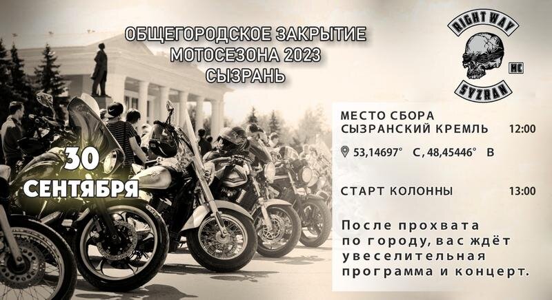 Колонна байкеров проедет по Сызрани в честь закрытия мотосезона. Сызранские байкеры озвучили дату общегородского закрытия мотосезона и сообщили, где намечен сбор. Напомним, в городе мотосезон открывается, как правило, в мае - событие проходит празднично, городские байкеры на стальных конях с ревом и грохотом мчатся по улицам Сызрани, после чего, «своей компанией», празднуют открытие сезона. И его закрытие проходит не менее торжественно. Оно состоится 30 сентября, в субботу. Сбор колонны будет происходить у Спасской башни Сызранского кремля с 12:00 до 13:00, после чего колонна мотоциклистов проследует по улицам города. Далее праздник продолжится на территории Club House сызранского отделения Right Way MC.