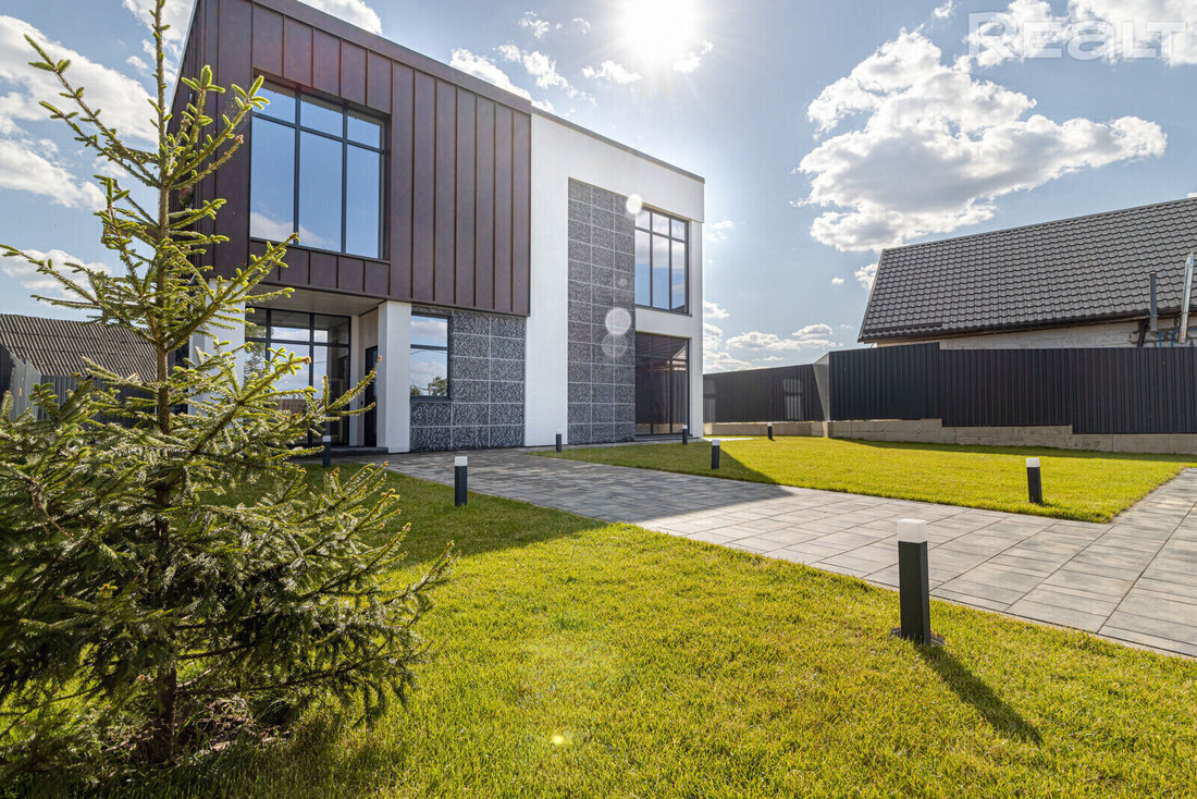 Этот двухэтажный коттедж находится в ближайшем пригороде Минска - агрогородке Ратомка. Своим внешним видом и интерьером он напоминает дома в современном американском стиле. Огромный плюс - коттедж полностью готов для проживания: можно заселяться сразу же после покупки. Как же выглядит дом и сколько за него просят? Стильный коттедж был построен в 2023 году по авторскому проекту. Его общая площадь - 195 квадратов, из них жилая - 116 м². Сам дом построен из кирпича и газосиликатных блоков. На крыше сделана гидроизоляция. Для повышенной безопасности на участке установлены двухсекционные ворота на электроприводе. Окна здесь большие витражные, установлены эко-стеклопакеты. В кухне-гостиной остекление в пол. Оттуда сразу можно попасть в зону барбекю. В доме два уровня. На первом находятся кухня-гостиная со стильным камином, облицованным плиткой, одна жилая комната, котельная-топочная, сауна и один санузел. На втором располагаются три спальни, два санузла и гардеробная. Для отделки всех помеще