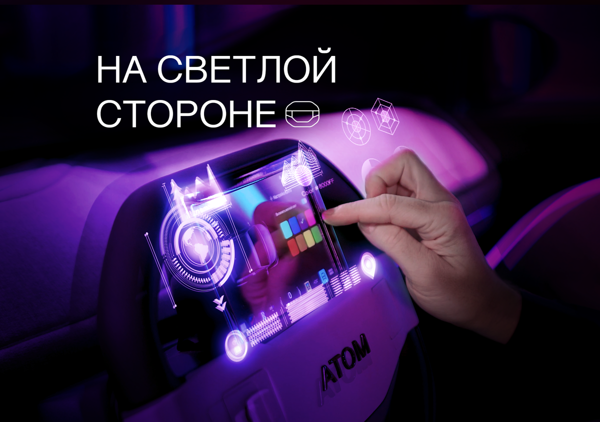 Ради безопасности и настроения. Помимо базовых, световая система АТОМа включает в себя функции, способные качественно улучшить водительский и клиентский опыт. Например, «живая» экстерьерная LED-панель на капоте. Она приветствует водителя при его приближении и сигнализирует, что машина разблокирована. Она же и попрощается с водителем анимацией, давая знать, что машина закрыта. RGB-подсветка предназначена также для дополнительной безопасности пешеходов: когда АТОМ притормозит перед пешеходным переходом, на ленте отобразится привлекающая внимание анимация — чтобы пешеход точно заметил электромобиль. Интерьерная LED-подсветка — на приборной панели и дверях — тоже взаимодействует с водителем и пассажирами: поприветствует, подскажет состояние заряда батареи, напомнит о ремне безопасности. Водитель сам сможет задать настройки цвета в разных режимах — чтобы он соответствовал стилю, настроению, а то и поводу. Как насчёт новогодней темы с красно-белыми переливами? Есть у системы освещения и сугу