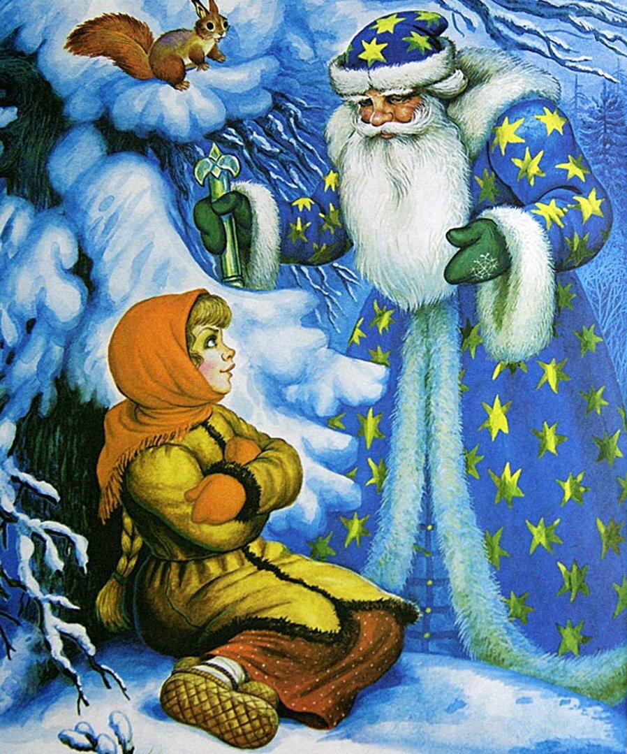 Девушка сидит под елью, дрожит, озноб ее пробирает. Вдруг слышит – невдалеке Морозко по елкам потрескивает, с елки на елку поскакивает, пощелкивает. Очутился на той ели, под которой девица сидит, и сверху ее спрашивает: