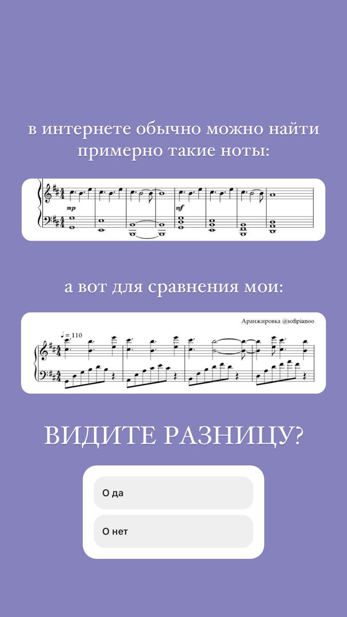 У каждого свои дорогие воспоминания, свое настроение и характер) у каждого свой, уникальный, список саундтреков к жизни) И знаете что? Вы действительно можете составить свой список таких композиций и проживать заново и заново эмоции и впечатления, погружаясь в игру У меня довольно большой банк моих авторских аранжировок, в карусели - только малая часть из них) Их не сравнить с нотами из интернета, у меня вы не найдете: 👉🏻 нот низкого качества Без знаков, обозначений, штрихов, аппликатуры.. ноты должны быть инструкцией для вас, а не ребусом, который надо привести в порядок, прежде чем сесть играть! Даже с платными нотами наблюдаю такую тенденцию 👉🏻 нот без разбивки по уровням Тяжело найти ноты произведения на определенный уровень игры. Обычно бывает 2 крайности: слишком сложные или слишком примитивные.. Мои аранжировки: ⭐️ разбиты их по уровням и на популярные композиции есть несколько переложений ⭐️ написаны со всеми обозначениями, динамикой, аппликатурой, фразировкой ⭐️со
