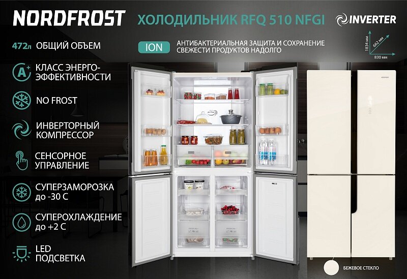Главное преимущество модели – инверторный компрессор, который обеспечивает высокую надежность, продолжительный срок службы и низкий уровень шума. Четырехдверный холодильник оснащен системой оттаивания Total No Frost, сенсорным управлением с цифровым дисплеем, LED – освещением в холодильном отделении, полезными технологиями и функциями для длительного хранения продуктов. Гарантия на холодильник NORDFROST – 1 год.
