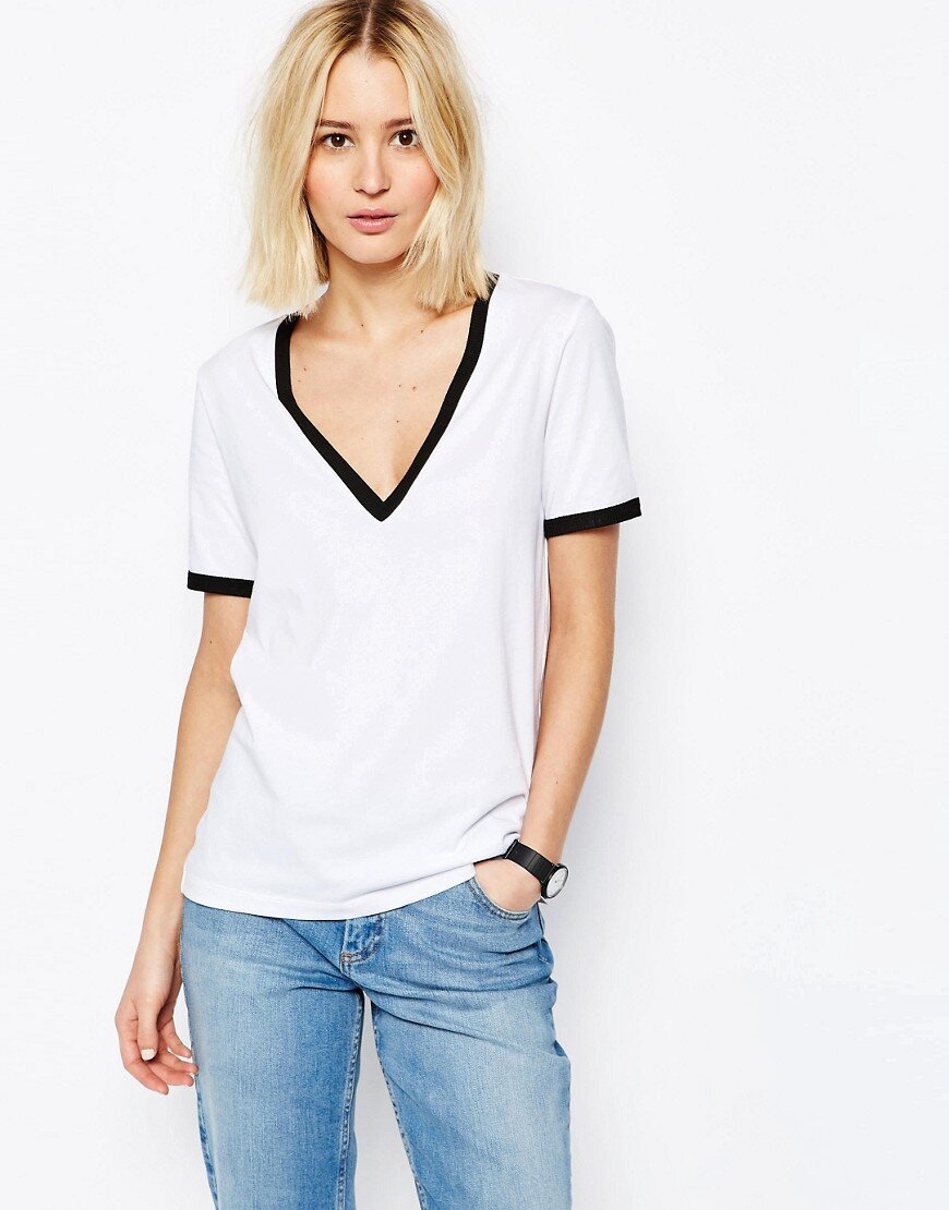 Такие футболки очень универсальны - их можно носить и отдельно, и в слоях. V-образный вырез хорошо смотрится с декольте или под открытой рубашкой. Футболки с V-вырезом выпускают как с коротким, так и с длинным рукавом. Их можно сочетать с джинсами, юбками, шортами - практически со всем!