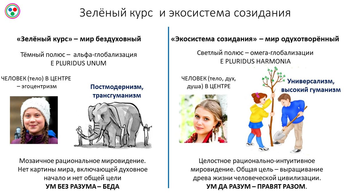 Зеленый курс – мир бездуховный, Экосистема созидания (термин, предложенный Фондом экономики созидания) – мир одухотворенный. Зеленый курс формирует темный полюс альфа-глобализацию под девизом E PLURIBUS UNUM. Экосистема созидания формирует светлый полюс омега глобализацию под девизом E PLURIBUS HARMONIA. В западной модели в центре человек, его материалистически понимаемое эго. В экосистеме созидания человек в центре, но он троичен – тело, дух, душа. Тело – материя, дух – мир идеальный, душа – их синтез, определяющий человечность. Мировоззрением западной модели является постмодернизм, целью трансгуманизм, в экосистеме созидания это универсализм и высокий гуманизм. Для западной модели характерно мозаичное рациональное мировидение, нет картины мира, включающей духовное начало бытия. В экосистеме созидания есть целостное мировидение, включающее духовное начало бытия и заявляется общая цель – выращивание древа жизни человеческой цивилизации.
