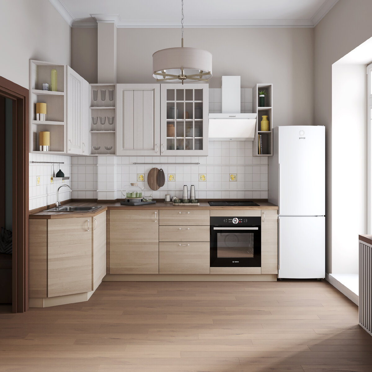 Проект кухни выполнен в помещении, где уже была расположена кухонная мебель, монтирован фартук, пол и потолок. Все это хозяева не планировали менять.
