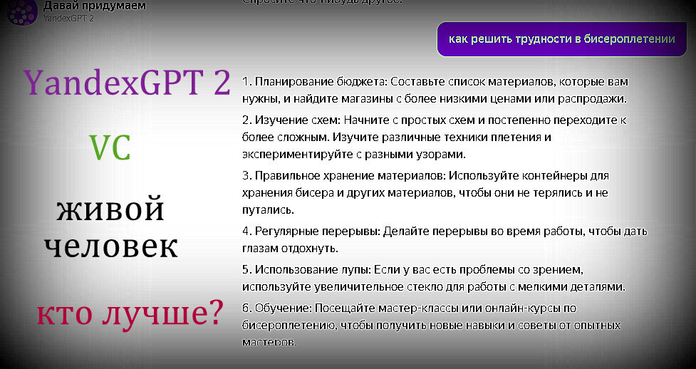 В последнее время все только и агитируют за чаты волшебные, мол, они за вас всё придумают и напишут... Ага... Как же... Подумала я и решила попробовать. Спросила чат, как решить трудности в бисероплетении, получила ответ и даже присвистнула от удивления... Ибо в той или иной последовательности уже видела эти тексты у других... И в других соцсетях тоже... Это что же, народ давно уже свои мысли не генерит, а пользуется готовыми шаблонами?! Я-то свято верила (видать, по себе судила), что мы, мастера, сами пишем то, что на душу ляжет... Иной раз и по 2, и по 3 часа статью "рожаешь", а иногда и неделями в черновиках лежит, по чуть-чуть дополняется... Сначала я от души повеселилась, ибо хотелось мне возразить каждому пункту :) 1) Планирование бюджета - угу :) Всем известна нескончаемая битва хомяка и жабы каждой рукодельницы! Я многих мастеров знаю, но мало видела тех, кто способен четко планировать бюджет и вписываться в него... Это же прям боль... 2) Изучение схем и разных техник плетения