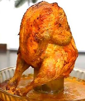 Кто ещё не готовил, рекомендую. Домашние будут в восторге. Понадобится: Приготовление: В банку налить воды до середины и положить туда разрезанное на 4 части яблоко. Куриную тушку вымыть, обсушить, натереть солью, перцем снаружи и изнутри, обмазать сметаной. На холодный противень положить лист фольги, поставить на него по центру банку, курицу усадить на банку так, чтобы ножками она стояла на противне. Поставить в разогретую до 200°С духовку. Запекать 1 час. Приятного аппетита!