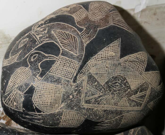 Предыдущую публикацию по данной теме можно прочитать по этой ссылке. В иконографии литотеки Ики есть один оригинальный символ, специфичный только для данного культурного феномена, поскольку связан он именно с образом динозавра. Это, если можно так выразиться, двуликая голова динозавра, т.е. голова с двумя открытыми пастями, изображенными по принципу осевой симметрии. О том, что это голова древнего ящера, а не, к примеру, кошачьего хищника, свидетельствует, прежде всего, то, что этот символ изображался на спинах динозавров. Кроме того, есть несколько камней, на которых этот символ помещен вместо головы динозавра, и это уже не оставляет сомнений в том, что изображает этот символ. Следует отметить, что «голова динозавра» — единственный символ в иконографическом комплексе камней Ики, схематизированный до орнаментального элемента. В собрании Кабреры есть немало камней небольшого размера, на которых этот символ изображен отдельно. Необходимо еще раз подчеркнуть, что в подавляющем числе случ
