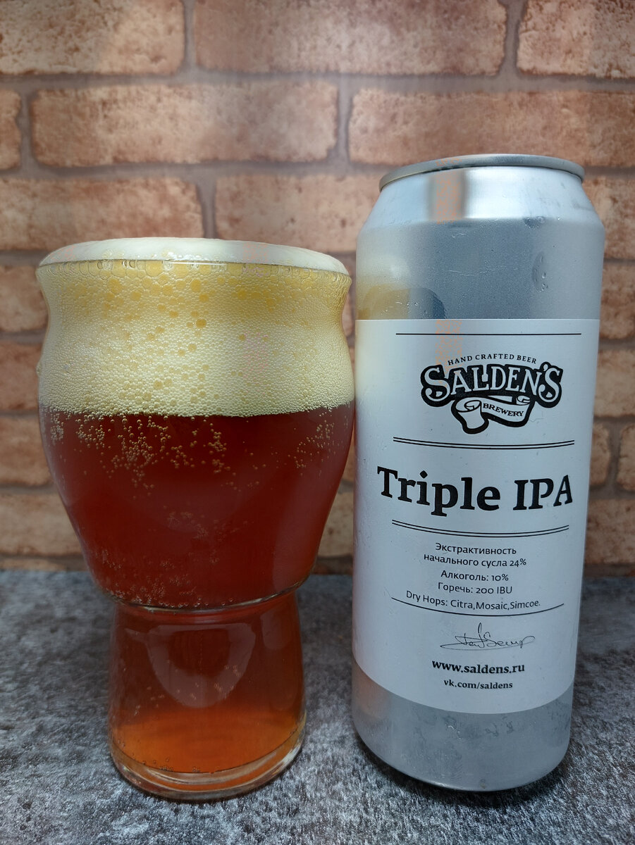 Тройной IPA от тульской Salden's на хмелях Citra, Mosaic и Simcoe. Плотность 24%. Горечь: 200. Состав: вода, солод пивоваренный, хмель, дрожжи. В общем то это всё, что нужно знать о напитке. Ну ещё добавлю, что фото делалось в начале августа, так что напиток был употреблён в пределах срока годности. Пена пышная и стойкая. Аромат лёгкий: тропики с цитрусами. Карбонизация умеренная. Вкус сильный и насыщенный: тропики, цитрусы и карамель. Много горечи. Для неподготовленного выпивохи это будет удар. Неслабый бёрн; цедра щипет язык и нёбо. Сладкое, очень сладкое карамельное послевкусие. Крепко, весьма, но без спиртуозности. Плотное и слегка тягучее. Добротная штука и отличный вариант на вечер, если хочешь ограничиться одной банкой. От себя добавлю, когда (и если) привыкаешь к горечи и бёрну, напиток становится в каком-то смысле приторно сладким. Но мне всё равно заходит отлично. За напиток отдал 222 рубля. В интернете можно встретить ценник от 250 до 324 рублей. Спасибо за внимание! Подп