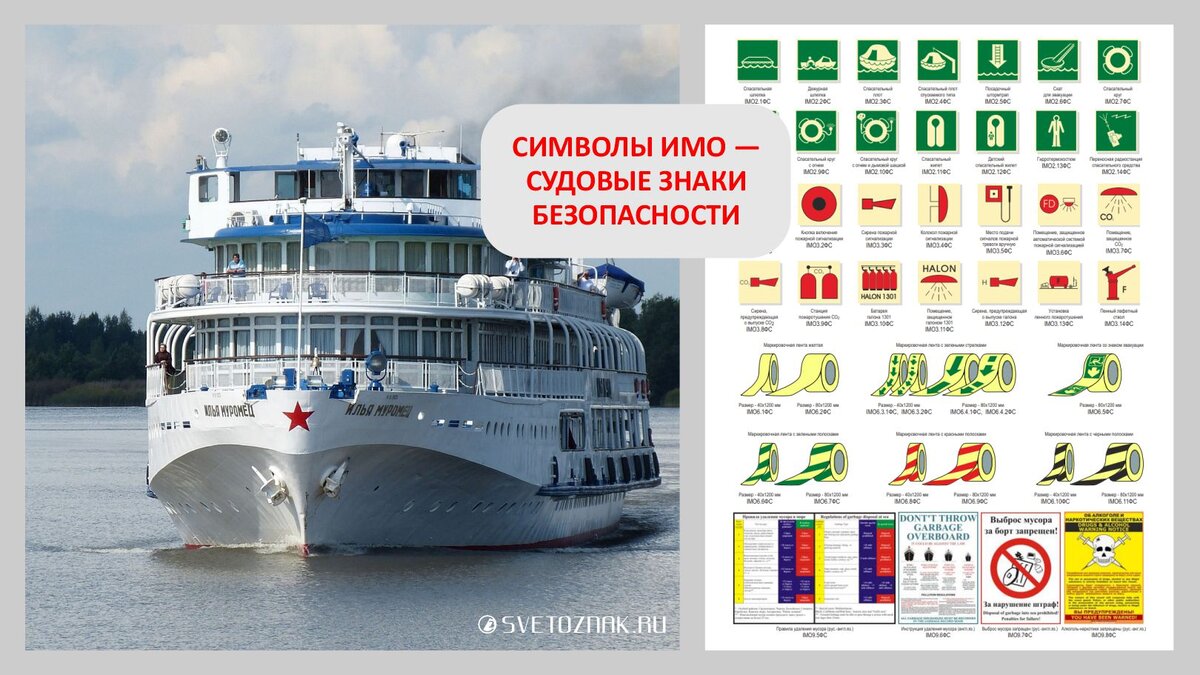 На речных судах все оборудование, системы эвакуации и средства обеспечения безопасности должны быть правильно обозначены. Для этой цели на всех судах, включая пассажирский речной транспорт, размещаются судовые знаки безопасности.