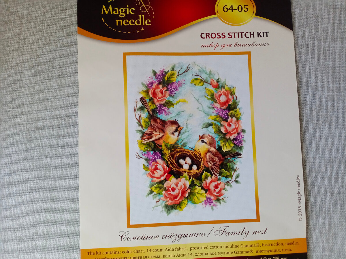Мои первые вышивки были из журнала "Валя-Валентина" на вафельном полотенце. Потом я познакомилась с наборами для вышивки. И хотя мой первый набор был куплен более 20-ти лет назад, до сих пор я не приобрела ни одного набора с равномеркой в качестве основы. Все мои наборы только с канвой. Так случилось не потому, что я имею что-то против равномерки, а просто видимо те сюжеты, которые меня привлекают, их наборы не подразумевают другую основу кроме канвы. И если до последнего времени я всегда вышивала на вложенной основе, пусть даже зашивка у сюжета не полная, то в прошлом году основу я всё таки впервые заменила. Я начала вышивать "Семейное гнёздышко" от Чудесной иглы. Там частичная зашивка, сюжет овальный. Когда я покупала набор, то уже знала, как и во что хочу оформить. Поэтому я изучала отшивы в интернете, как смотрится эта вышивка на разных основах. В итоге, канву 14 каунта из набора я заменила на равномерку 30 каунта. На самом деле, то, что я видела в интернете мне понравилось и на ка