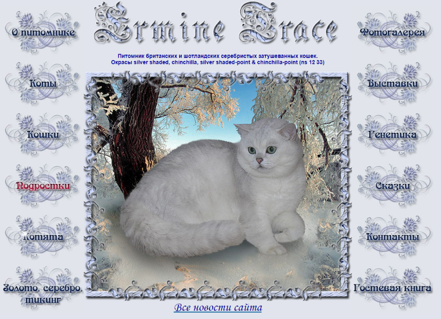 В 2004-2005-х годах, когда я купила свою первую племенную кошку, серебристую шиншиллу, и начала с ней работать, заводчики общались на профильных форумах и как раз начинали в массовом порядке обзаводиться сайтами питомников. Мне повезло, я работала в IT, худо-бедно знала HTML, Photoshop, представляла, как воткнуть в код страницы JavaScript, чтобы получить какие-нибудь красивые визуальные эффекты, и свой первый сайт сделала сама. Вначале это была "Страничка кошечки Лемурочки", но довольно быстро она превратилась в "сайт питомника Ermine Trace". Я постоянно что-то в нем меняла, перерисовывала, украшала, и сегодня, глядя на сохранившиеся старые варианты, испытываю умиление. Такой он был у меня маленький, хорошенький, со всякими финтифлюшечками, блестюшечками, попытками изобразить визуальные эффекты на кнопках. При наведении мышкой кнопка-картинка меняла цвет, а по кнопке "Котята" еще и бегали белые искорки: