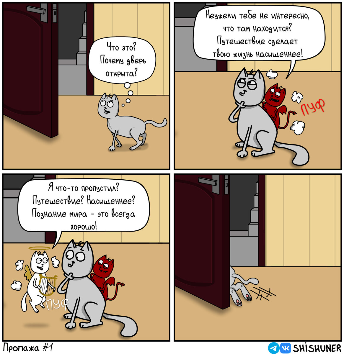 И пускай некоторые моменты комикса кажутся не столь уж реалистичными, (я, конечно же, говорю не о говорящем коте), многие размышления "пропажи" вполне можно перенести на наши современные реалии: и о людях...