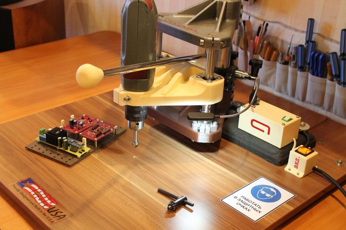 Иногда встречаюсь с людьми, которые считают, что 3D-принтер - это не более чем игрушка. Так, безделушки всякие попечатать, побаловаться, поиграться… Хочу поделиться (выложено в конце поста) своим проектом сверлильного станка, который я разработал под свои индивидуальные технические задачи (главная из которых - возможность обработки панели размером до 400 мм) и напечатал на обычном 3D-принтере. Конструкция станка достаточно проста: Нужно найти какое-то мощное и ровное основание (станину). В моем случае это была дверца шкафа, сделанная из МДФ. Снизу прикручены ножки (файл модели найдете в общей ссылке на проект). Вертикальная стойка. Её нужно прикрепить максимально жестко и максимально перпендикулярно к станине станка. Я для этих целей использовал измерительную стойку (нашел в гараже). Вы можете использовать ровный кусок трубы или что-то подобное (модели выложены вместе с исходниками и не составит большого труда подправить их под другой диаметр вертикальной стойки). Нижняя и верхняя опор