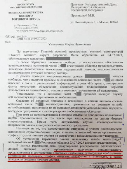 В одной из воинских частей Ростовской области, в которой служит множество призванных по частичной мобилизации и которая находится на линии боевого соприкосновения в зоне СВО, вскрылись факты «ненадлежащего обеспечения» бойцов. Об этом говорится в ответе Военной прокуратуры ЮВО на запрос депутата Госдумы от КПРФ Марии Прусаковой. Как следует из текста, коммунистка узнала о проблемах со снабжением войсковой части (её номер в КПРФ решили не называть) из интернета. Якобы бойцам не хватает еды и медикаментов, есть проблемы с обещанным денежным довольствием, а положенные отпуска личному составу не предоставляются. Сообщается, что в части служит 413 человек, призванных во время частичной мобилизации в сентябре 2022 года. В прокуратуре депутату ответили, что по большей части изложенная ею информация подтвердилась. «До военнослужащих в полном объёме не доводились положенные нормы продовольствия, в том числе при нахождении на линии боевого соприкосновения. Кроме того, допускались случаи несвоевр