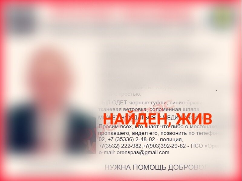 В Оренбургской области сотрудники полиции и волонтёры ПСО «ОренСпас» разыскивают Дмитрия Неберекутина. Пенсионер 1928 года рождения 24 сентября 2023 ушёл из дома в поселке Шахтный Соль-Илецкого городского округа. До настоящего времени местонахождение пропавшего не установлено. По оперативным данным, пенсионера видели на вокзале Оренбурга. Поисковая операция, проведённая накануне вечером, 25 сентября, не дала результата дедушка не найден. «ОренСпас» запустил проект городской патруль. Любой желающий может принять участие в поисках Дмитрия Неберкутина. Приметы: рост 165-170см., худощавого телосложения, волосы короткие, седые. Особые приметы: отсутствует часть нижней губы, ходит с тростью. Был одет: чёрные туфли, синие брюки, чёрная, тканевая ветровка, соломенная шляпа. Пожилой мужчина нуждается в медицинской помощи. Всех, кто что-либо знает о местонахождении пропавшего или видел его, просят позвонить по телефонам: 02, +7 (35336) 2-48-02 — полиция, +7(3532) 222-982,+7(903)392-29-82 — ПСО «