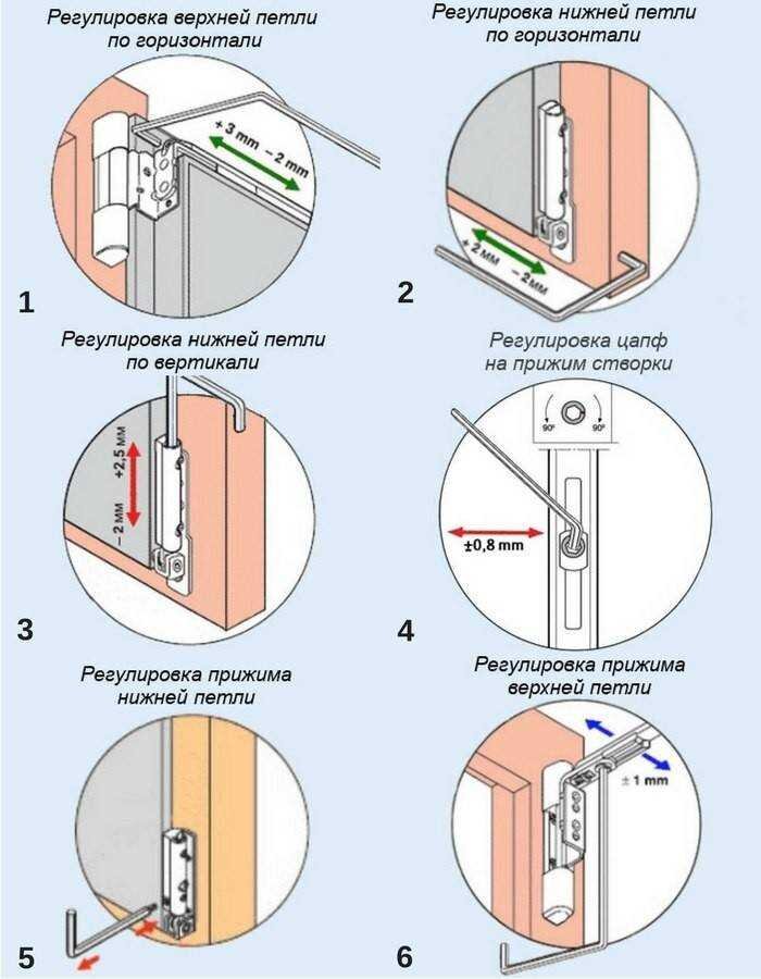 Если окно не удерживается в открытом положении или провисает, необходимо произвести регулировку петель.