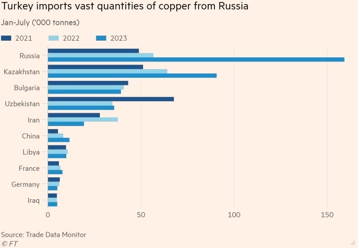 Поставки через третьи страны скрывают истинную зависимость Европы от российских товаров Гигант торговли сырьевыми товарами Glencore в июле этого года доставил тысячи тонн российской меди через Турцию в Италию, подчеркивая, как поставки через третьи страны скрывают истинную зависимость Европы от российского сырья. Согласно таможенным документам и фотографиям, с которыми ознакомилась Financial Times, зарегистрированный на Лондонской бирже трейдер нефти и металлов приобрел не менее 5000 тонн медного листа производства российской Уральской горно-металлургической компании (УГМК), который был экспортирован из Турции в итальянский порт Ливорно в июле. Хотя отраслевых санкций в отношении торговли российскими металлами не существует, ограничения были наложены на некоторых миллиардеров и производителей с начала военного конфликта. В прошлом году Великобритания и ЕС ввели санкции против руководителей УГМК, но не против самой компании. США ввели более широкие санкции в отношении УГМК в июле этого