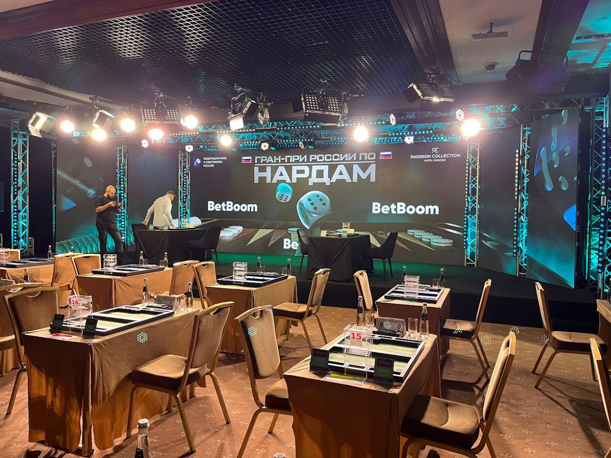В минувшее воскресенье, 24 сентября, завершился грандиозный праздник, который подарила нардистам Федерация нард и бэкгэммон России при поддержке компании BetBoom. Это был финал турнира Гран-при России по нардам, который прошел в московской гостинице «Рэдиссон Коллекшен Москва». В финал через отборочные турниры вышли по 16 игроков в короткие и длинные нарды. Они должны были определить, кому и в каком размере достанется доля от общего призового фонда в 5 миллионов руб Директором турнира был известный московский нардист Ацамаз Арсагов. К проведению турнира Федерация привлекла актив популярного Международного клуба нардистов (Клуб 555) - Елену Громенкову (Москва), Евгения Журавлева (Кемерово) и Эдуарда Назаряна (Тбилиси). Они расставили на столах красивые доски с нежной расцветкой игрового поля, удобные часы и табло для ведения счета. Не было никаких древних стаканчиков для перемешивания костей, создающих в турнирном зале постоянный гул. Вместо них рядом с досками расположились симпатичн