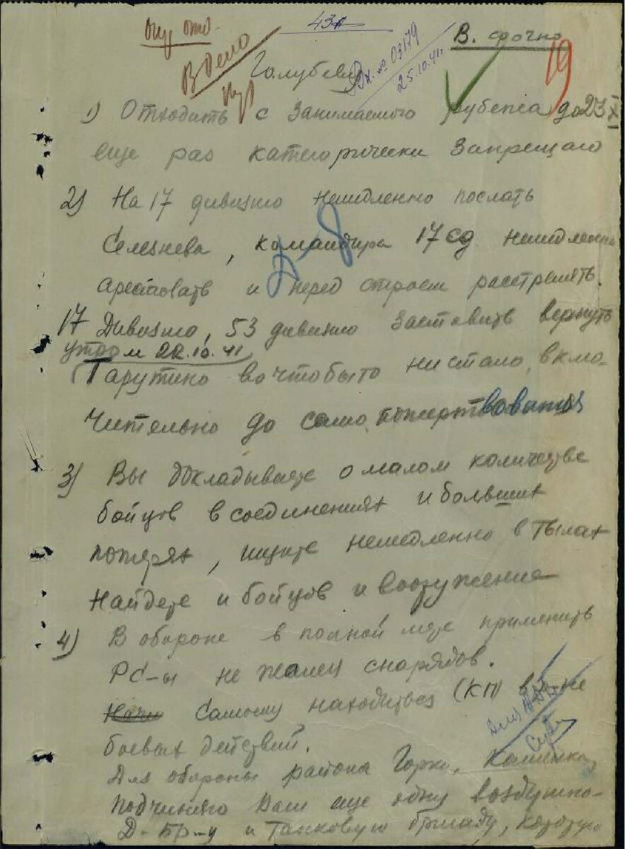 «За самовольный уход с позиций расстрелять»… Командарм К.Д. Голубев еще утром 20 октября сообщил в штаб фронта, что 17-я дивизия «под сильным давлением противника начала отход с фронта р. Протвы» в направлении Угодского Завода, и что «не имеет горючего, продовольствия и боеприпасов». Он предложил отвести ее к Тарутино. Однако Г.К. Жуков, угрожая командарму отстранением от должности и преданием его суду, приказал восстановить положение по всему фронту. В том числе «во что бы то ни стало фронт 17 стрелковой дивизии удерживать», «без письменного приказа не отходить». Вечером этого же дня в штаб фронта дополнительно было сообщено, что «командир дивизии принимает соответствующие меры по обеспечению, но просит срочного оказания помощи». На запрос, почему 17 стрелковую дивизию оставили без снабжения, каково ее положение на текущий момент, начштаба армии уклонился от ответа, сославшись на отсутствие связи. Помня об угрозах со стороны Г.К. Жукова, командарм всю ответственность за отход от р. Пр