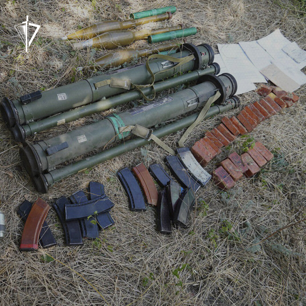 В тайнике, оборудованном в нежилом строении, найдено 27 тротиловых шашек, два гранатомёта РПГ-27, выстрелы к РПГ-7 и подствольному гранатомёту, гранаты и магазины к автоматам. Здесь же обнаружены методические пособия минобороны, СБУ и нацгвардии Украины по применению средств связи, организации боевой работы артиллерии и специальной подготовке войск.