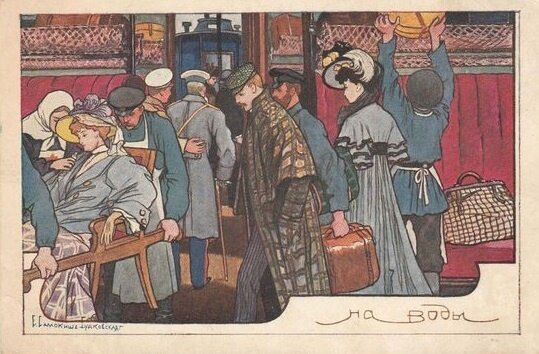 пассажиры, носильщики размещают багаж. Слева молодая женщина в портшезе, сопровождаемая сестрой милосердия. Она прекрасно одета, но,