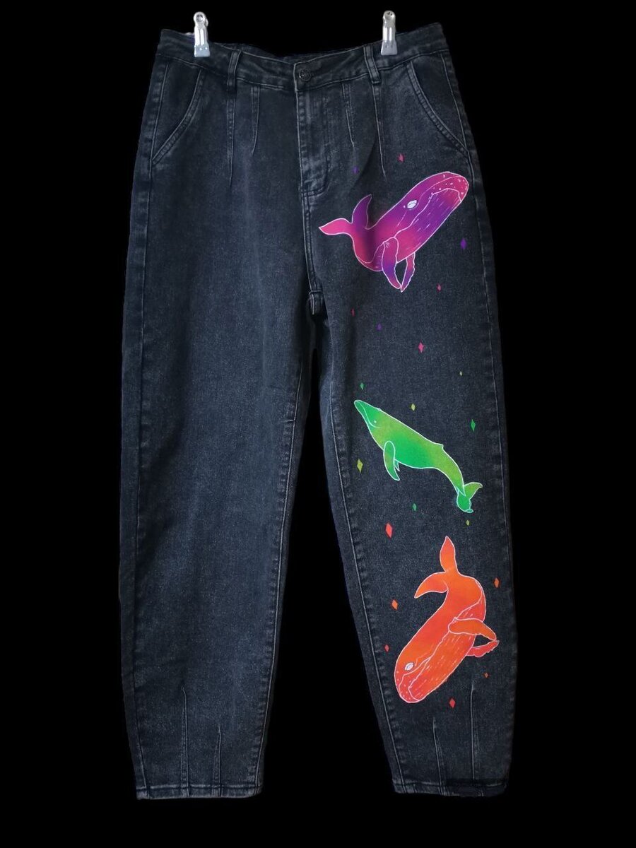 Третьим этапом была задача как-то создать наброски на ткани, чтобы по ним уже отрисовывать готовые работы. Обдумав разные варианты и побоявшись, что просто нарисовать с нуля несколько млекопитающих🐋 я не смогу, я решила сделать трафареты.