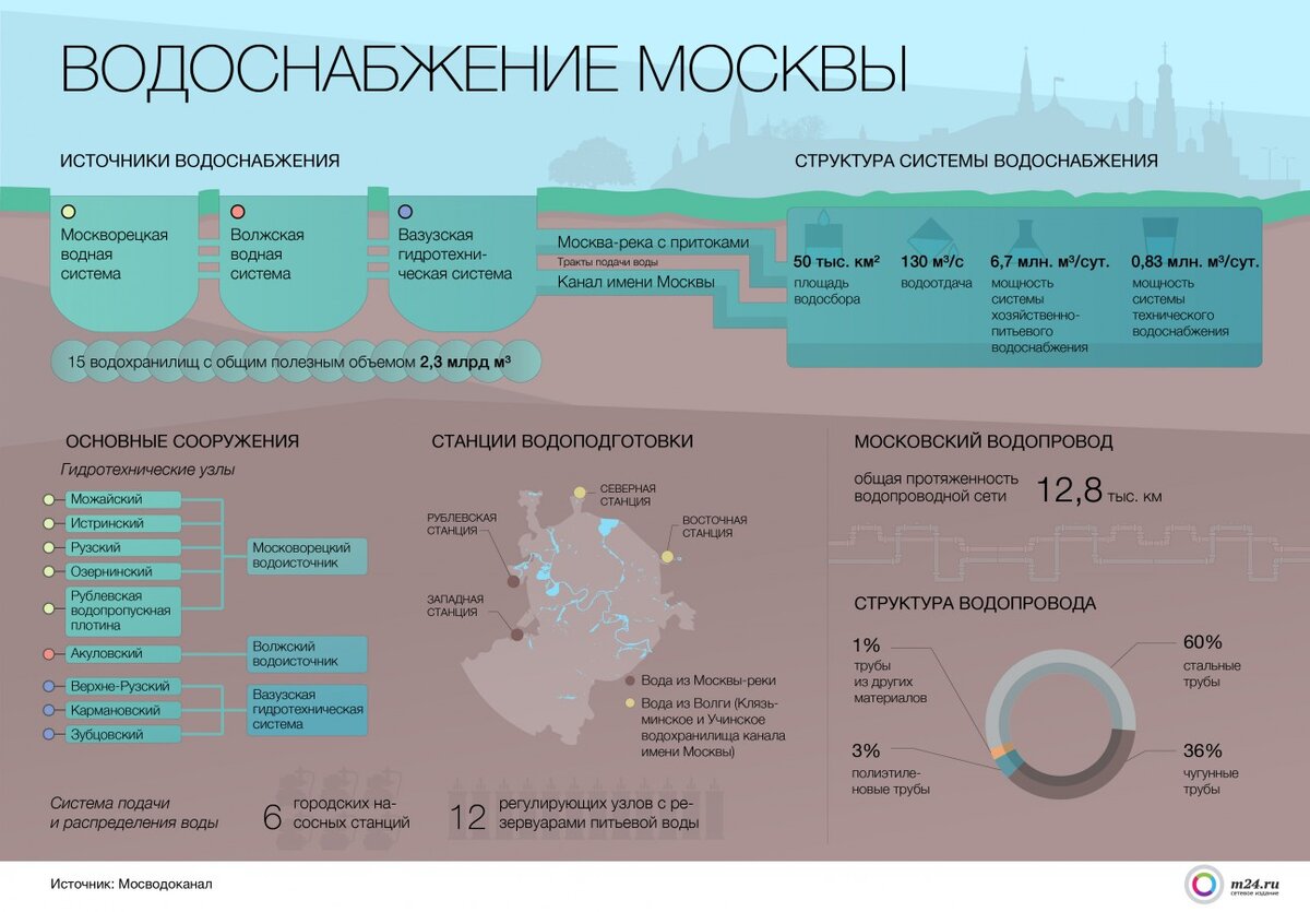 Уровень организации водоснабжения в Древней Руси в основном соответствовал достижениям в этой области в европейских странах. В XI или начале XII в. первый водопровод из деревянных труб появился на Ярославовом дворище в Новгороде. Позднее в царских поместьях, монастырях, крупных хозяйствах строились водопроводы, в конструкции которых использовались металлические трубы. Согласно описям 1641–1662 гг., колодец Троице - Сергиевой лавры был оборудован чёточным водоприёмником с системой подъёма воды по медным трубам. Водопроводная (а) и канализационная (б) трубы на дворище Ярослава Чёточный (а) и колёсный (б) подъёмники Троице - Сергиевой лавры. Реконструкция проф. Н.И. Фальковского Оригинальная водопроводная система существовала в Московском Кремле. При постройке князем Дмитрием Донским в1367 г. каменного города на территории, примерно равной площади нынешнего Кремля, был сооружен каменный тайный ход к воде. Однако кроме тайников в Кремле был построен и первый самотёчный водопровод. Источник