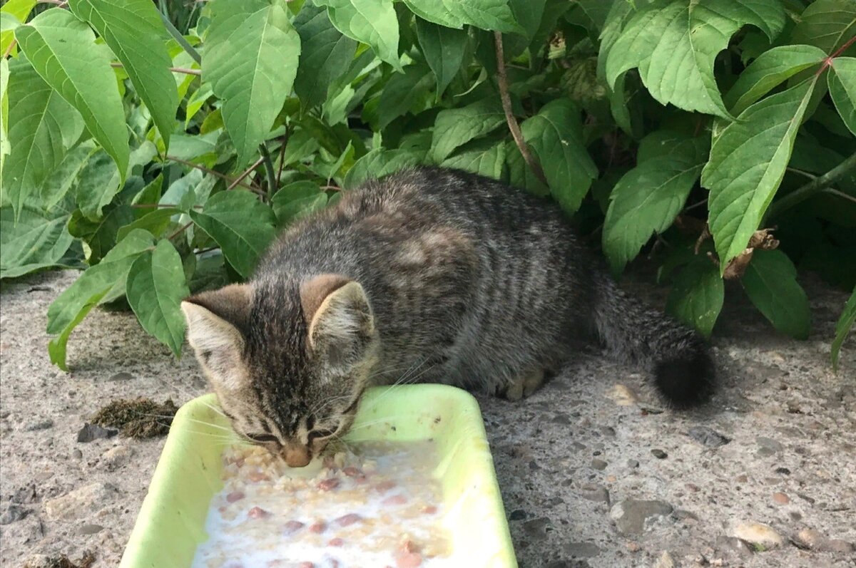 И вдруг опять «мяу». Из кустов робко вышел полосатый котенок и неуверенно пошёл к, так называемой, дежурной тарелке у бывшей теплотрассы. Рассказ продолжает наш волонтёр Алла: "Я затаила дыхание, чтобы не напугать малыша. Поглядывая по сторонам, котенок начал есть. Было заметно, что малыш изрядно голоден. Однако стоило мне пошевелиться, котенок снова юркнул в кусты. Но голод оказался сильнее. И вот он уже доедает кашу с мясом. А я пытаюсь сфотографировать полосатика. Откуда он тут взялся? Всех местных котят я знаю. Может, кто-то потерял.